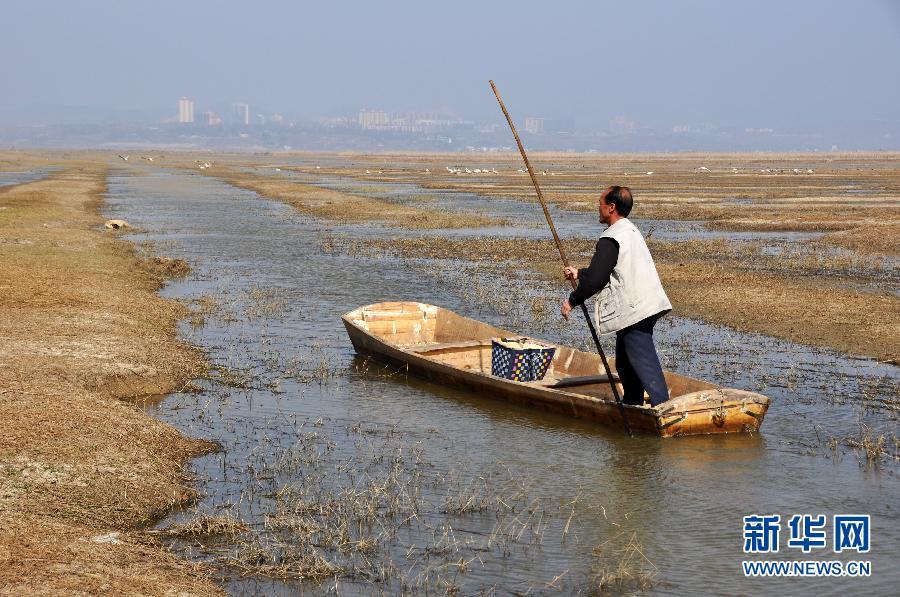 3月10日,臧尔军撑船入海给鸟类投食。图片来源:新华网