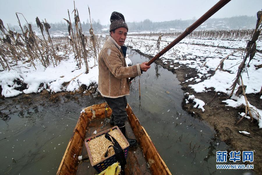 臧尔军冒着大雪撑船入海给候鸟投食(2015年1月10摄)。图片来源:新华网