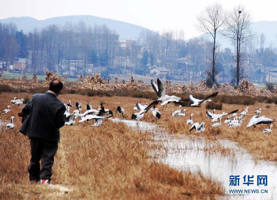 坚守十八载 臧尔军在给越冬鸟类投食(2012年1月13日摄)。图片来源:新华网