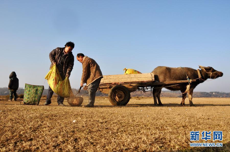 臧尔军(右)与儿子在凝冻的草海边给候鸟投食(2013年12月23日摄)。图片来源:新华网