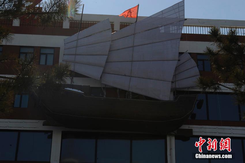 3月11日,在长春市一建筑外墙上,悬挂着一艘巨大的帆船。张瑶 摄