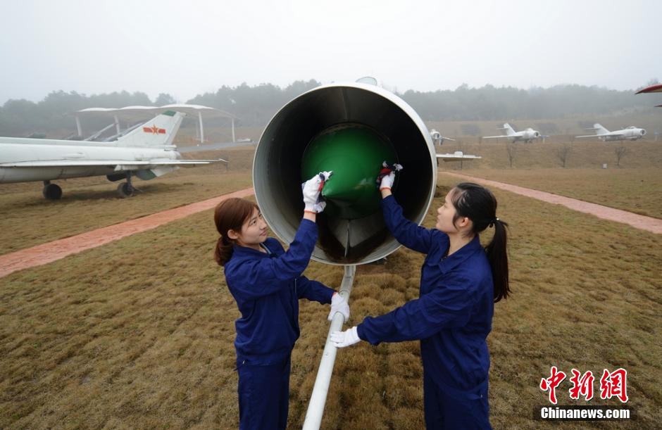 女学生们对飞机表面进行清洁。杨华峰 摄