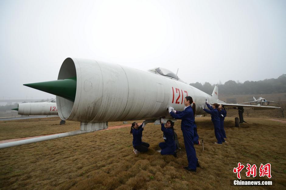 女学生们对飞机表面进行清洁。杨华峰 摄
