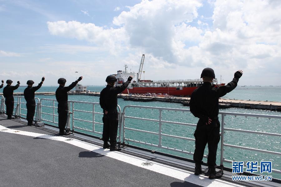 3月10日,在新加坡樟宜港,中国海军两栖船坞登陆舰长白山舰上的特战队员向码头上欢迎的人群挥手致意。经过18个昼夜的连续航行,中国海军第十八批护航编队于当地时间3月10日抵达新加坡樟宜港停靠。编队由两栖船坞登陆舰长白山舰、导弹护卫舰运城舰和综合补给舰巢湖舰组成。停靠期间,编队将补给燃油、蔬菜、水果等物资,有计划地向新加坡海军方和当地民众开放参观舰艇。新华社记者 张月琳 摄 图片来源:新华网
