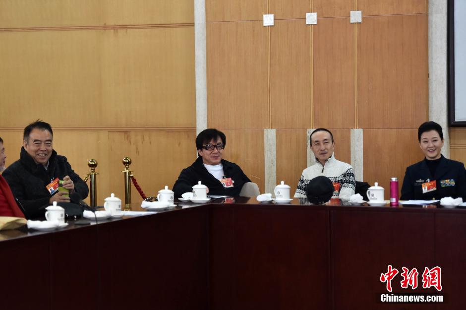 3月11日,全国政协十二届三次会议文艺界别讨论继续进行。成龙、陈凯歌、宋祖英、巩汉林参加小组讨论。中新社发 翟羽佳 摄