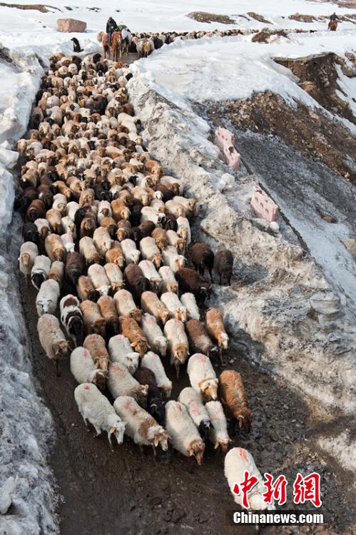 3月初,新疆伊犁牧民转场,行走在果子沟牧道。每年的3月初至中旬,新疆伊犁部分县市在博尔塔拉蒙古自治州冬草场越冬的40万余头(只)牲畜,开始10余天、300公里路的迁徙,经果子沟转入伊犁春秋草场。赖宇宁 摄