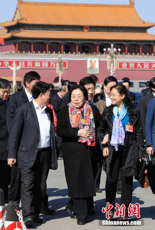 3月11日,中国人民政治协商会议第十二届全国委员会第三次会议举行第四次全体会议。全国政协委员江泽慧(中)参加会议。中新社发 侯宇 摄