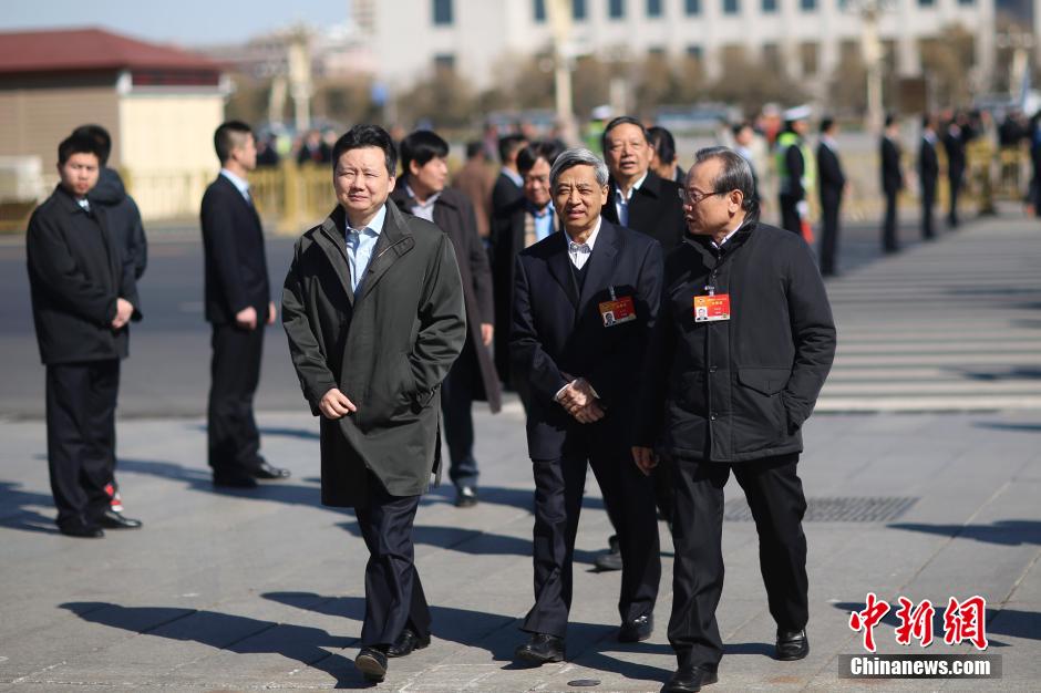 3月11日,中国人民政治协商会议第十二届全国委员会第三次会议举行第四次全体会议。梅兴保委员(中)步入会场。中新社发 盛佳鹏 摄