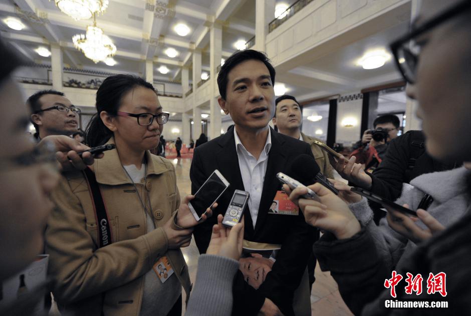 3月11日,全国政协十二届三次会议在人民大会堂举行第四次全体会议,多名政协委员就有关议题作大会发言。会前全国政协委员,全国工商联副主席,百度公司董事长兼首席执行官李彦宏接受记者采访。中新社发 张斌 摄