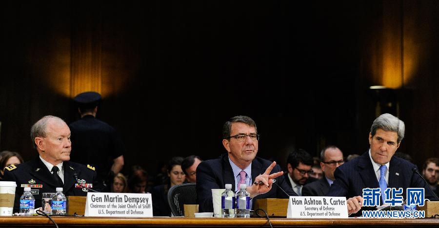 3月11日,在美国首都华盛顿,美国国务卿克里(右)、美国国防部长阿什顿·卡特(中)及美军参谋长联席会议主席邓普西参加参议院外交关系委员会关于奥巴马寻求正式军事授权打击“伊斯兰国”的听证会。美国国防部长阿什顿·卡特11日说,打击极端组织“伊斯兰国”所要花费的时间可能要超过美国总统奥巴马此前向国会提交的军事授权议案中规定的三年期限。新华社记者鲍丹丹摄