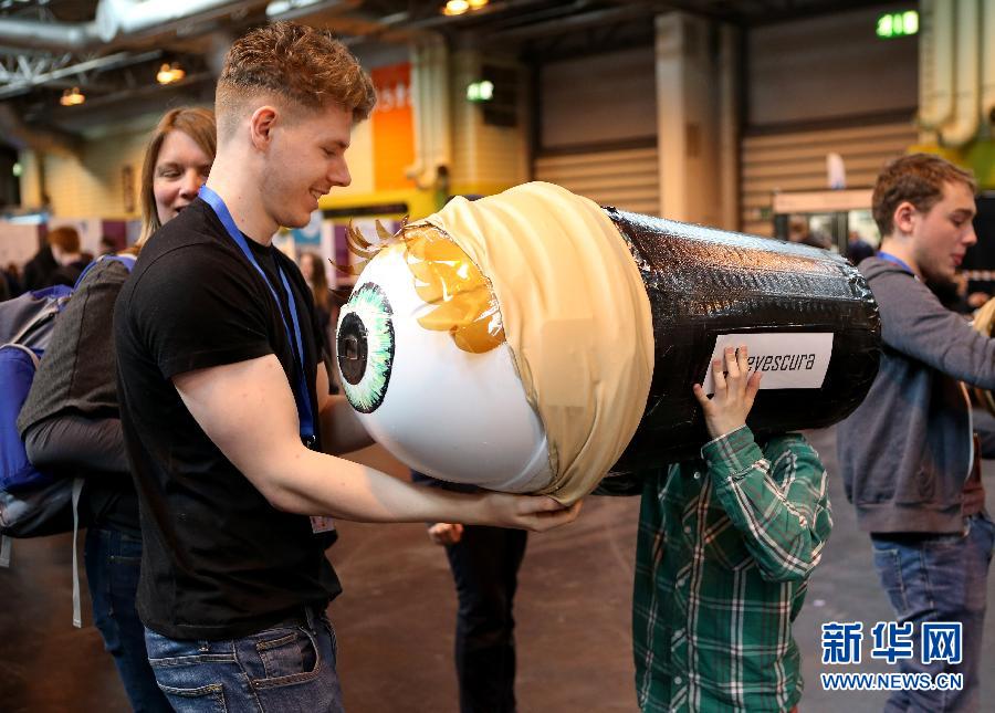 3月11日,在英国伯明翰,一名小观众体验人眼成像原理。 3月11日至14日,“大爆炸”英国青年科学家和工程师展览会在英国伯明翰举行。新华社记者韩岩摄