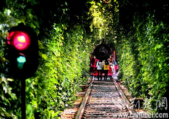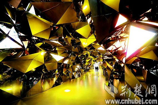 武汉光谷步行街的一处过街天桥,被管理者精心打造出两个主题场景——用不规则的镜子和彩色灯光组成的“造梦空间”主题(下图),以及用绿色通道和火车铁轨组成的“绿野仙踪”主题(上图)。梦幻的效果和童话般的意境,昨日引来众多市民观赏拍照。(湖北日报记者 张朋 摄)