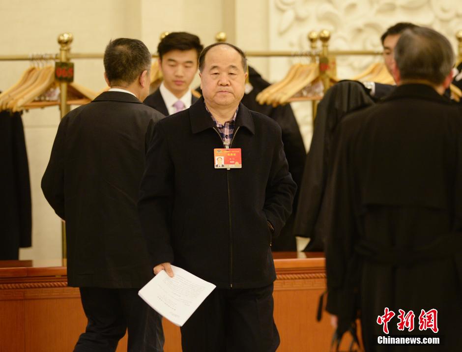 3月12日,十二届全国人大三次会议举行第三次全体会议,听取最高人民法院院长周强关于最高人民法院工作的报告,听取最高人民检察院检察长曹建明关于最高人民检察院工作的报告。全国政协委员莫言列席会议。 中新社发 侯宇 摄