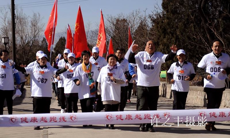2015年3月11日,十二届全国人民代表大会第三次会议代表休息日,清晨,十余名全国人大代表来到北京昌平蟒山森林公园参加“共筑中国心,健康起跑线”活动,与400余名志愿者一起徒步“健康跑”,通过徒步方式倡导健康生活方式,普及疾病预防知识。来自山东代表团的全国人大代表赵步长在跑步结束时说“作为人大代表,要以身作则用实际行动倡导健康的生活方式,践行健康中国。”图为十余名全国人大代表来与400余名志愿者一起徒步“健康跑”。