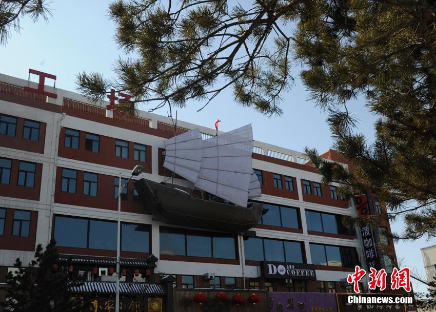 3月11日,在长春市一建筑外墙上,悬挂着一艘巨大的帆船。张瑶 摄