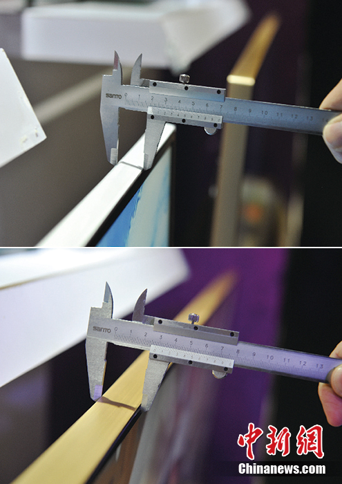 同为65吋的彩电,纯电商平台商品厚度达到26mm,国美门店所售商品不到21mm。