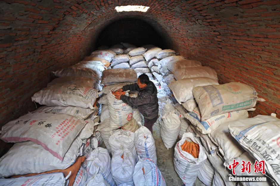 3月11日,辽宁省沈阳市沈北新区尹家乡新农村,村民王君家的地窖里堆满了成袋的胡萝卜。近日,有沈阳“胡萝卜第一村”之称的新农村陷入胡萝卜滞销困境,去年10月收获的30多万斤的胡萝卜深藏地窖少有人收购。据了解,农民缺少市场信息、菜品本身竞争力不高、受南方北运菜冲击等是滞销的主要原因。 中新社发 孙昊声 摄
