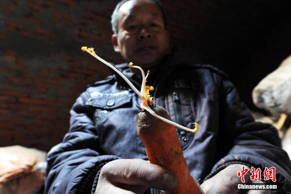3月11日,辽宁省沈阳市沈北新区尹家乡新农村,村民苗书春家的地窖里堆满了成袋的胡萝卜,有些已经长出了芽。中新社发 孙昊声 摄