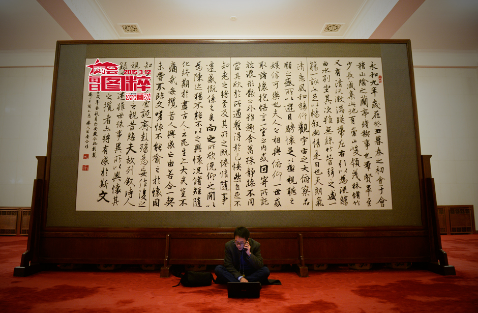 3月12日,第十二届全国人民代表大会第三次会议在北京人民大会堂举行第三次全体会议,听取最高人民法院院长周强关于最高人民法院工作的报告,听取最高人民检察院检察长曹建明关于最高人民检察院工作的报告。一名记者在大会堂内席地而坐发稿。中新社发 侯宇 摄
