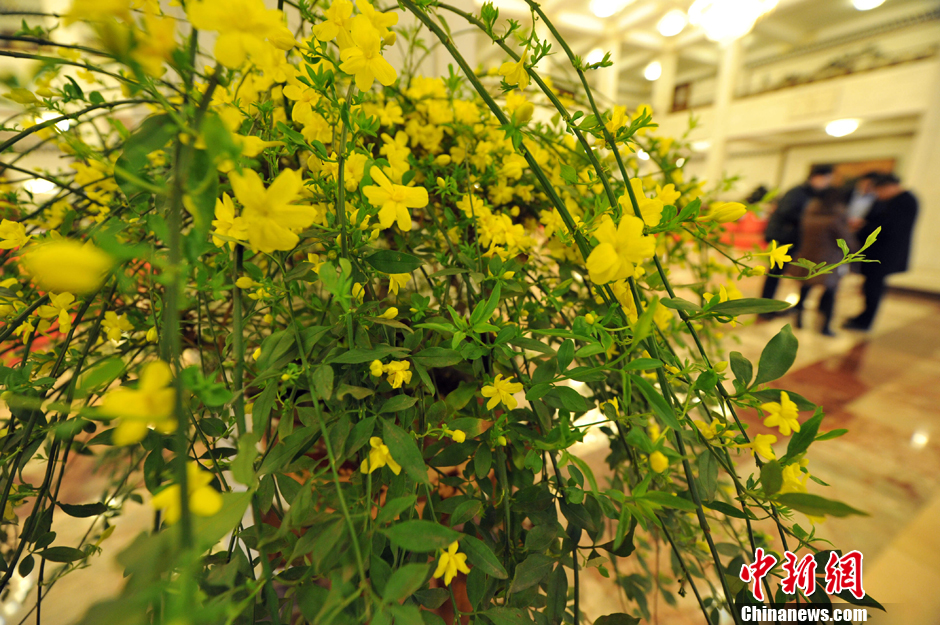 3月11日,两会期间的北京人民大会堂内春花竞相盛开,充满了浓浓的春意。中新社发 张斌 摄