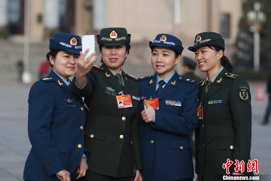 3月12日上午,第十二届全国人民代表大会第三次会议在北京人民大会堂举行第三次全体会议,听取最高人民法院院长周强关于最高人民法院工作的报告,听取最高人民检察院检察长曹建明关于最高人民检察院工作的报告。解放军女代表在广场自拍留影。中新社发 盛佳鹏 摄