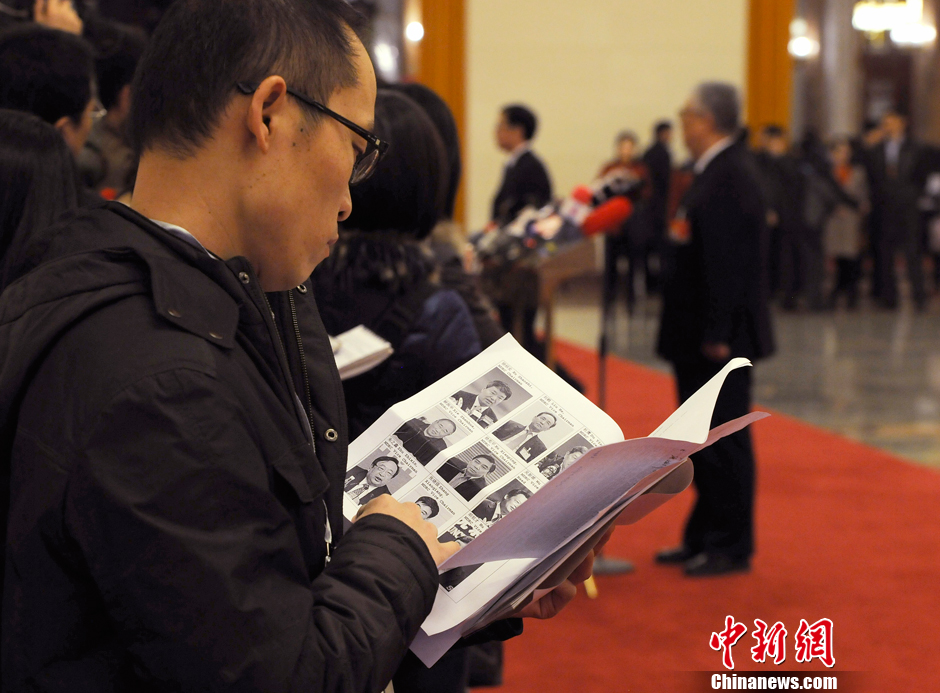 3月12日,十二届全国人大三次会议举行第三次全体会议,听取最高人民法院院长周强关于最高人民法院工作的报告,听取最高人民检察院检察长曹建明关于最高人民检察院工作的报告。一名记者手持事先准备好的部长“脸谱”在人民大会堂北大厅采访。中新社发 侯宇 摄