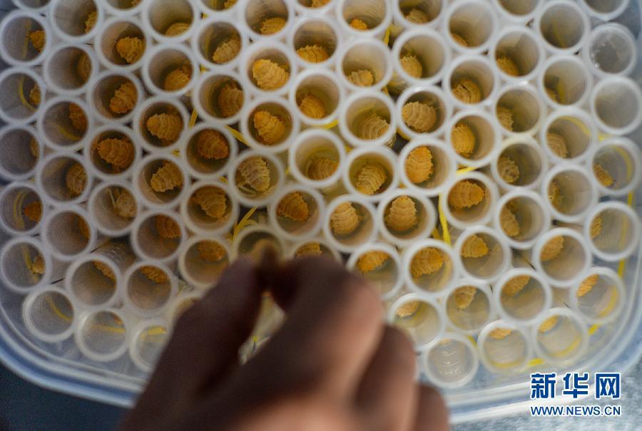 3月11日,工作人员将附着有花绒寄甲幼虫的大麦虫整齐排列,一个月后,它们通过寄居的方式吸收大麦虫身上的营养能够长成米粒大小的成虫。在湖南省林科院天敌繁育中心,有一支防治生物灾害、维护森林健康的“天敌战队”,战队成员包括花绒寄甲、赤眼蜂、肿腿蜂、瓢虫等有害生物的天敌。繁育中心的工作人员先在野外采集天敌,然后进行工厂化繁育,成熟之后再将它们投放到森林中。据中心技术负责人颜学武介绍,它们能够消灭包括二化螟、粉蝶、马尾虫、天牛在内的200多种常见农林害虫。湖南省林业厅森林病虫害防治检疫站站长刘跃进告诉记者,除了不会污染环境和农林产品外,生物防治的成本优势会随着规模化而越来越明显,同时这种“以虫治虫”的方式不会引起害虫抗药性的增强,效果更加可持续化。据了解,中国目前已有十多个省份建立了自己的天敌繁育中心,各省均根据本地有害生物的种类有针对性地进行天敌繁育。其中湖南、北京、山西等地已开始进行市场化推广。刘跃进介绍,2014年,全国通过天敌繁育治理林业生物灾害的面积已超过1000万亩。从“十三五”开始,随着国家的不断重视和投入,“天敌战队”将成为未来治理生物灾害的一支主力部队,它们的战场也将成倍扩大。 新华社记者 白禹 摄 图片来源:新华网