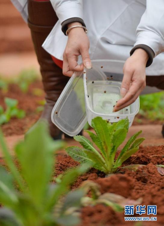 3月11日,工作人员将瓢虫放到隔离温室大棚内来培养它们的野外生存能力。在湖南省林科院天敌繁育中心,有一支防治生物灾害、维护森林健康的“天敌战队”,战队成员包括花绒寄甲、赤眼蜂、肿腿蜂、瓢虫等有害生物的天敌。繁育中心的工作人员先在野外采集天敌,然后进行工厂化繁育,成熟之后再将它们投放到森林中。据中心技术负责人颜学武介绍,它们能够消灭包括二化螟、粉蝶、马尾虫、天牛在内的200多种常见农林害虫。湖南省林业厅森林病虫害防治检疫站站长刘跃进告诉记者,除了不会污染环境和农林产品外,生物防治的成本优势会随着规模化而越来越明显,同时这种“以虫治虫”的方式不会引起害虫抗药性的增强,效果更加可持续化。据了解,中国目前已有十多个省份建立了自己的天敌繁育中心,各省均根据本地有害生物的种类有针对性地进行天敌繁育。其中湖南、北京、山西等地已开始进行市场化推广。刘跃进介绍,2014年,全国通过天敌繁育治理林业生物灾害的面积已超过1000万亩。从“十三五”开始,随着国家的不断重视和投入,“天敌战队”将成为未来治理生物灾害的一支主力部队,它们的战场也将成倍扩大。 新华社记者 白禹 摄 图片来源:新华网