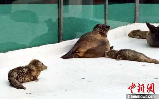 近日,辽宁省大连圣亚海洋世界,人工饲养环境下诞下世界首例双胞胎的雌性斑海豹,在生产之后拒绝哺乳第二只幼仔。中新社发 孙昊声 摄