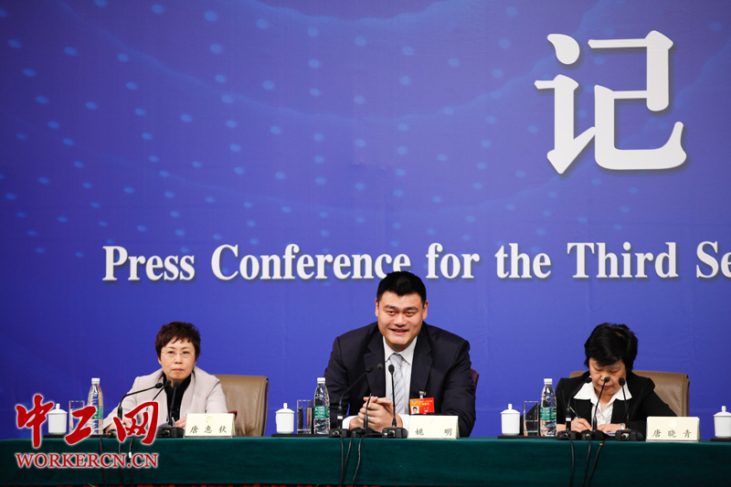 2015年3月9日上午,全国政协十二届三次会议召开主题为“政协委员谈发挥人民政协在社会主义协商民主中的重要作用”的记者会,在最后一个记者提问之前主持人唐惠秋笑着说,“最后一个问题希望大家让姚明委员休息一下,请提问其他委员。这是姚明担任全国政协委员之后第一次参加政协新闻发布会,媒体的大部分提问都抛向姚明委员。 (中工网记者 韩靖摄)