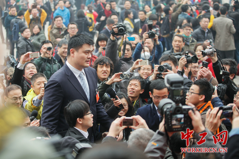 2014年3月3日,又是一年“两会”开幕时,姚明如约出现在人民大会堂东广场,依然被大批媒体关注,但关注的焦点已从身高转向了提案。当年,他提出了《关于出台象牙及象牙制品贸易禁令》的提案,虽然看似跨界,但那一年他担任了动物保护的形象宣传大使。 (中工网记者 韩靖摄)