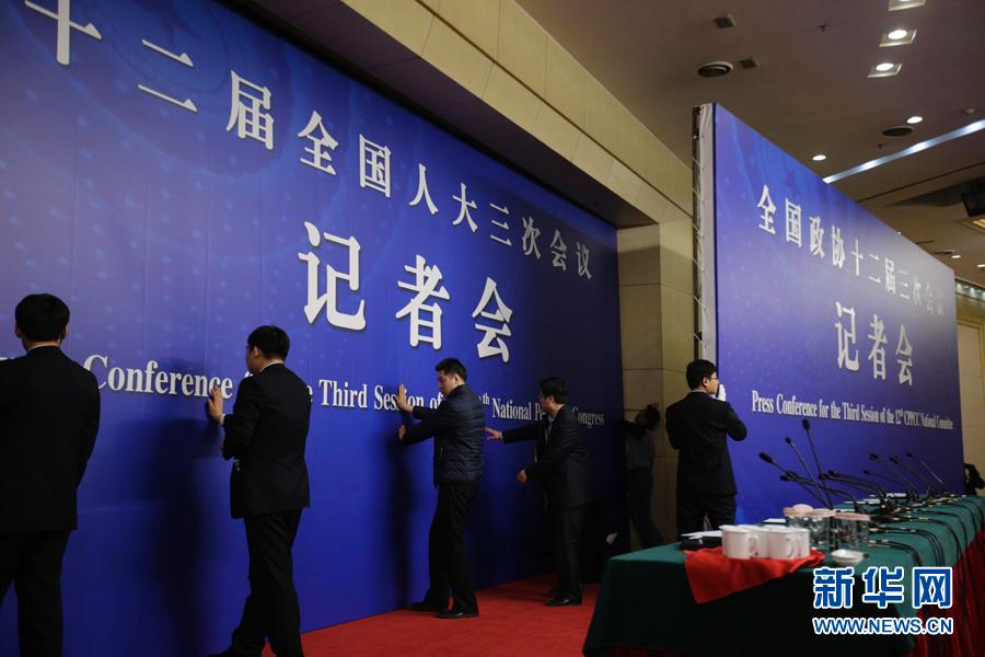 【都很忙】在位于北京梅地亚中心的两会新闻中心,工作人员在一场记者会结束后更换背景板,为下一场会议做准备。 新华社记者殷刚摄 图片来源:新华网