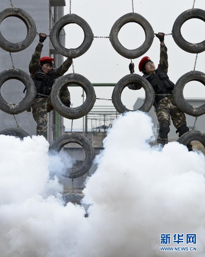 3月12日,“雪鹰女子特勤分队”两位女队员在模拟实战环境下进行体能训练。新华社记者 赵戈 摄