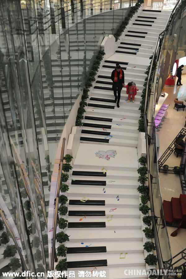 2015年3月13日,山东济南,在济南和谐广场内,出现会发声的“钢琴楼梯”,吸引众多好奇的市民前来体验这个特殊的“钢琴楼梯”。 楼梯黑白相间相当于钢琴的键盘,只要踩到楼梯上即可发出美妙的乐声。