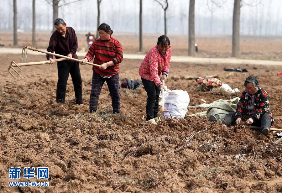 3月13日,在安徽省亳州市谯城区赵桥乡穆阁村中药材种植地里,药农正在收获中药材紫丹参。眼下正是中药材紫丹参收获时节,“药材之乡”安徽省亳州市的药农们抓住有利天气,抢收、晾晒中药材。目前,亳州市中药材种植面积已达108万亩,常年种植的中药材达30多种,从事种植、加工、购销中药材的从业人员达100万人,已形成800多个中药材种植专业村。新华社发(刘勤利 摄)