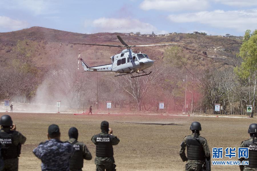 3月13日,在洪都拉斯的特古西加尔巴,运送贩毒组织头目何塞·米格尔·安达尔的直升机抵达一个军营。洪都拉斯警方在3月12日的一次行动中逮捕了何塞·米格尔·安达尔,警方指控他将毒品通过墨西哥贩毒组织运往美国。 新华社发(拉斐尔摄)