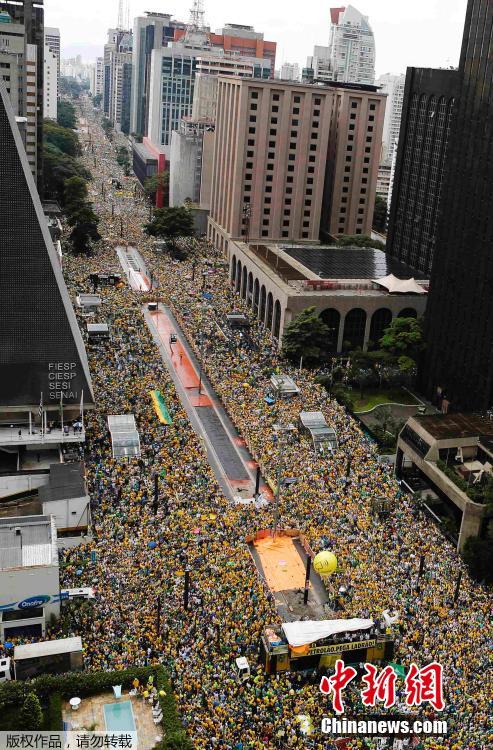 图为当地时间3月15日,圣保罗保利斯塔大道,游行的人群将这里挤的水泄不通。