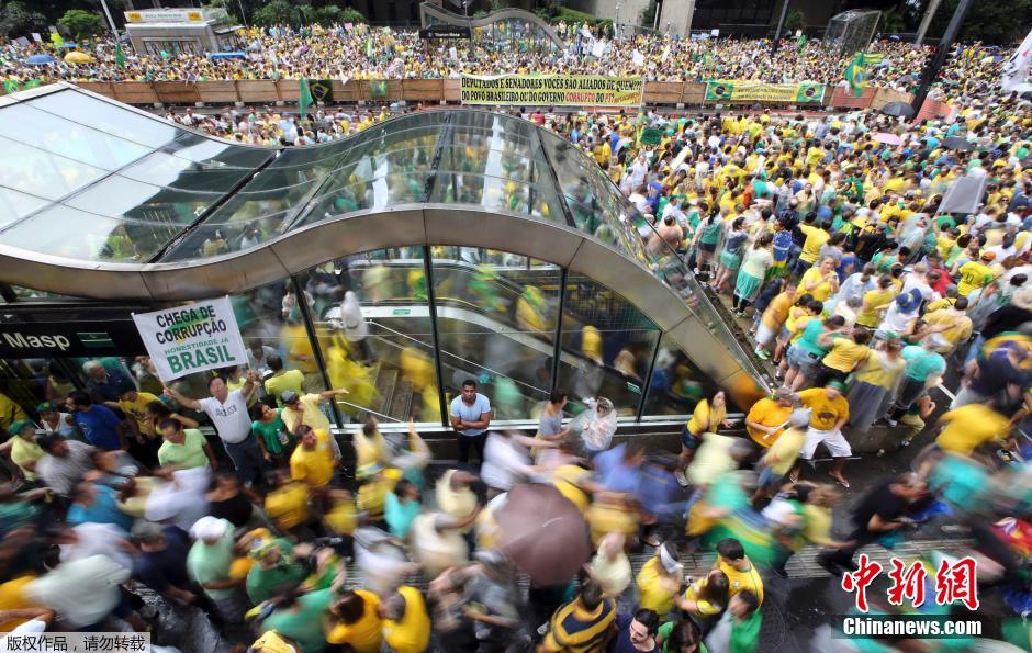 图为当地时间3月15日,圣保罗的保利斯塔大道,游行示威的人群。