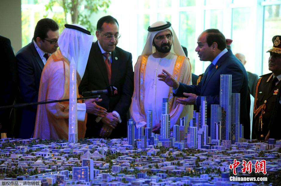 图为埃及总统塞西、阿拉伯联合酋长国副总统兼总理、迪拜酋长穆罕默德和埃及投资部部长Ashraf Salman在国会厅观看将建埃及开罗新首都模型。