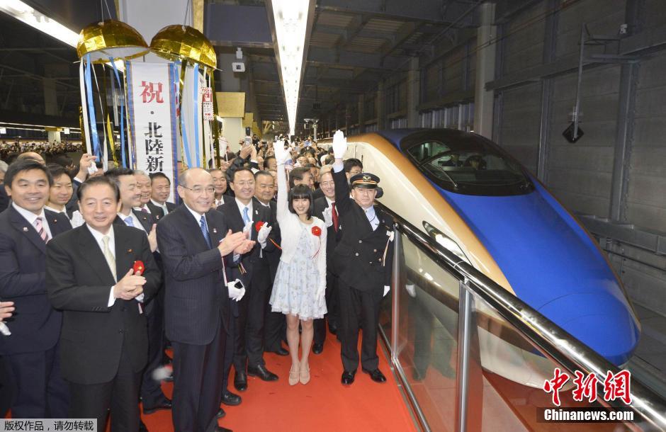 图为北陆新干线“长野-金泽”延伸段首辆新车准备从金泽车站出发,驶往东京,人们在出发仪式上鼓掌。