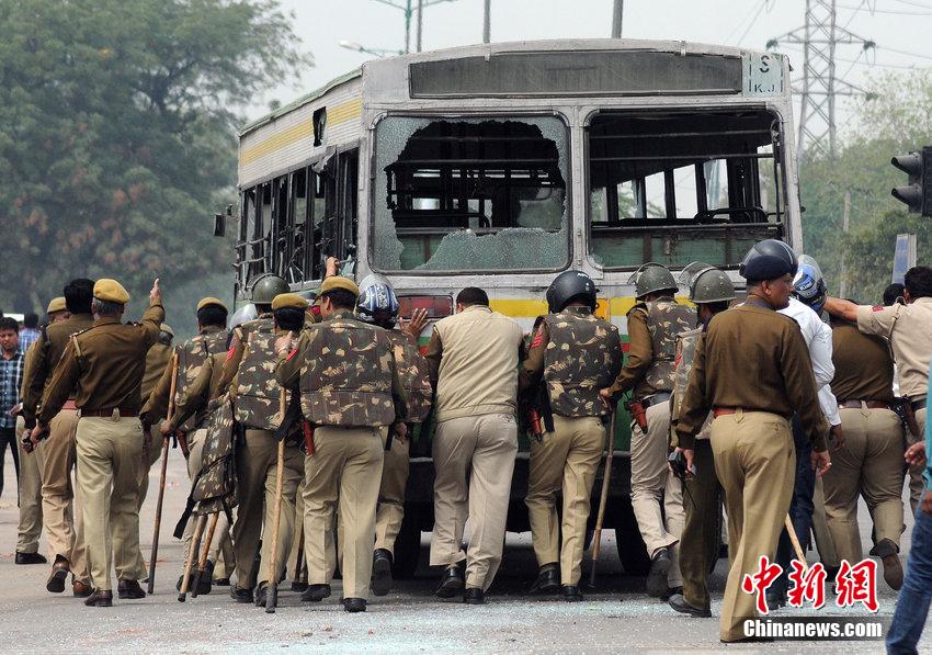 当地时间2015年3月13日,印度新德里,DTC公交车撞死一名11岁的男童,引发民众愤怒,示威者将公交车点燃抗议。 图片来源:CFP视觉中国