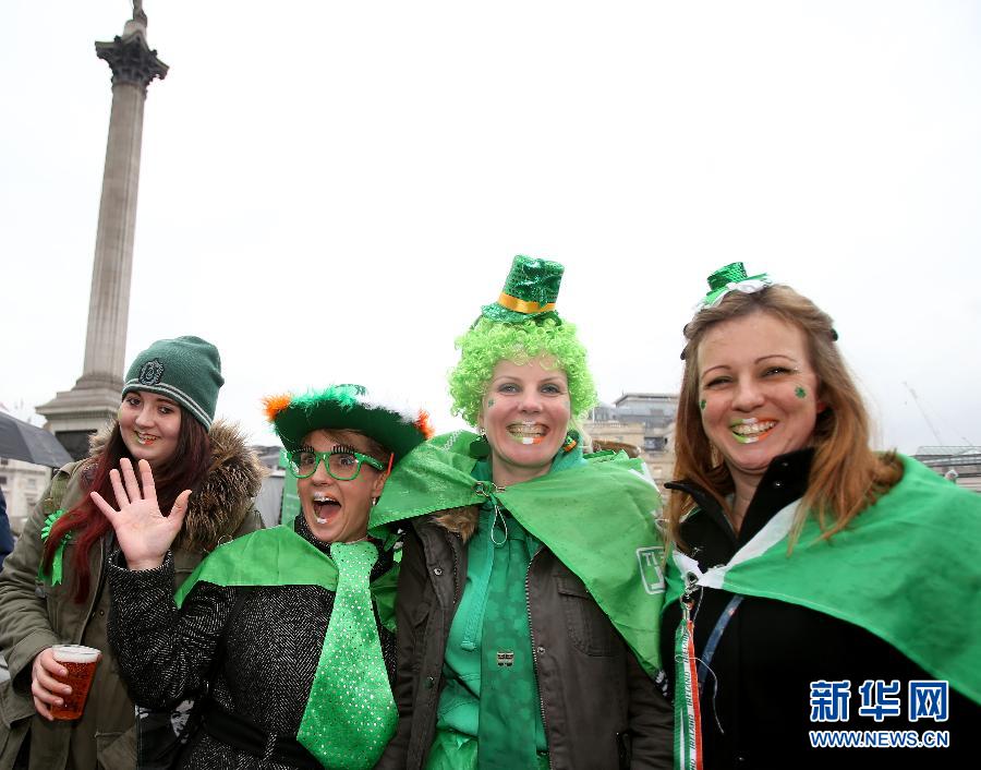 3月15日,在英国伦敦特拉法加广场,人们穿戴以绿色为主色调的服饰庆祝圣帕特里克节。每年3月17日是爱尔兰传统的宗教和文化节日圣帕特里克节,最初是为了纪念传教士圣帕特里克,后来成为爱尔兰国庆日。按照传统,人们会穿戴各种以绿色为主色调的服饰参加集会和游行活动。新华社记者韩岩摄