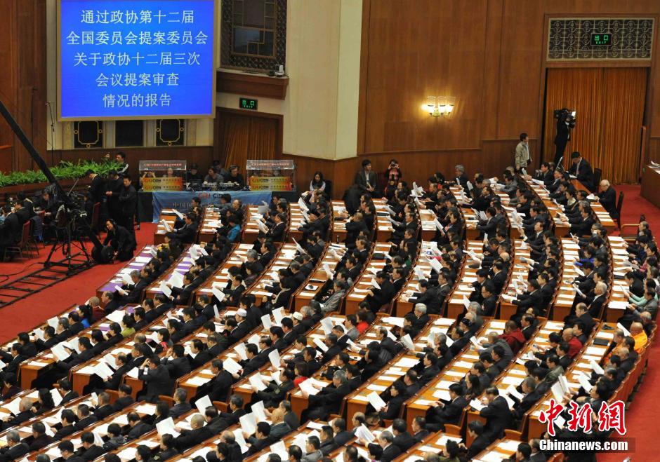 3月13日日下午3时,全国政协十二届三次会议在人民大会堂举行闭幕会,通过政协第十二届全国委员会第三次会议关于常务委员会工作报告的决议,通过政协第十二届全国委员会提案委员会关于政协十二届三次会议提案审查情况的报告,通过政协第十二届全国委员会第三次会议政治决议。 中新社发 翟羽佳 摄