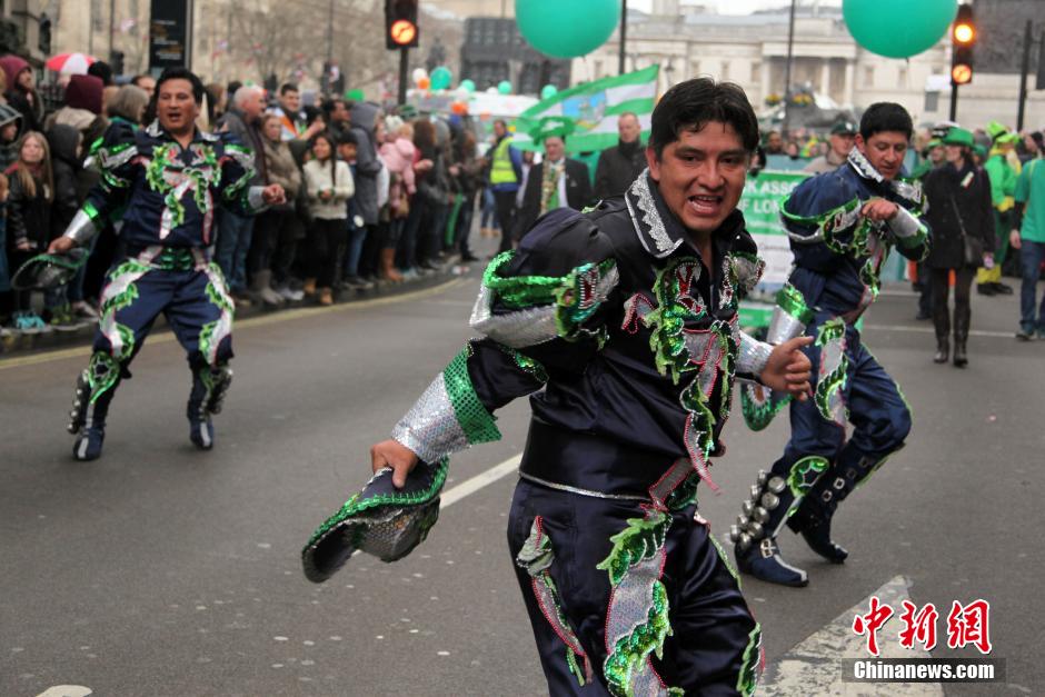 3月15日,英国伦敦举行盛大游行庆祝“圣帕特里克节”。圣帕特里克节是爱尔兰民族一年中最重要的传统节日,也是爱尔兰的国庆节。每年的圣帕特里克节,全球各地的爱尔兰人都身着鲜艳的盛装,佩戴象征幸运的三叶草,共同庆祝。中新社发 周兆军 摄