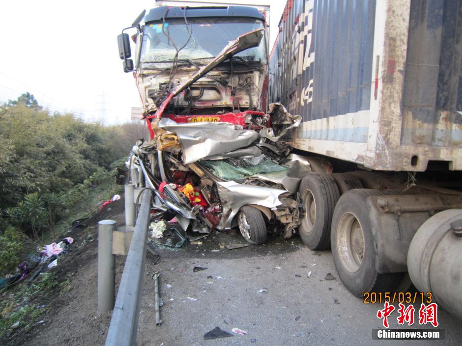 3月13日,一辆非法运营的面包车在载客途中遭车祸被压扁。当天凌晨3时33分许,浙江G60沪昆(沪杭)高速公路嘉兴段往上海方向92公里处,一辆江西牌照的集装箱车与浙GZ7H65面包车发生刮擦,后一辆上海牌照的货车又撞上面包车,事故造成4人死亡、7人受伤,死者中包括两名婴儿,一名两岁,另一名才几个月大。事故原因正在进一步调查中。 中新社发 浙江嘉兴高速交警 摄
