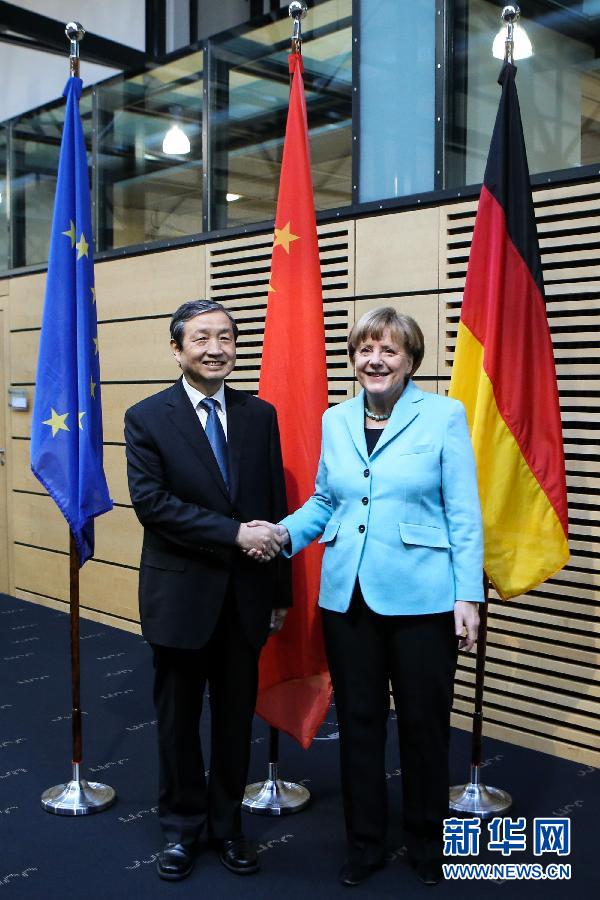 3月15日,德国总理默克尔(右)在汉诺威与中国国务院副总理马凯握手。德国总理默克尔15日在汉诺威会见出席2015年汉诺威消费电子、信息及通信博览会的国务院副总理马凯。 新华社记者张帆摄
