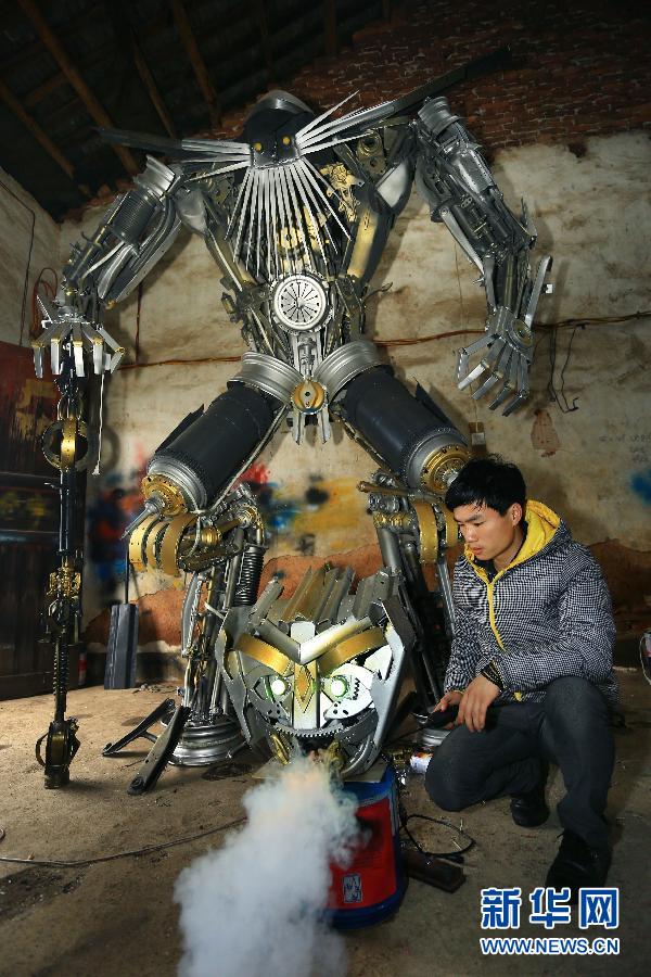 3月14日,在湖南省衡阳县樟木乡余氏父子制作变形金刚的车间,余凌云在调试变形金刚的喷雾特效。湖南省衡阳县樟木乡曹田村的农民父子余治林、余凌云,利用废旧汽车零件和网络上找到的图片,拼接起一个个体型巨大的变形金刚,这些制作精良的变形金刚不仅引来了络绎不绝的参观者,还为他们带来了超过百万元的年收入。有着美术基础的余治林从2007年开始萌生了制作变形金刚的想法,在没有任何外界支持的情况下,前后耗费近三年时间,终于在2010年制作了第一批变形金刚模型。经过几年的打拼,他和儿子余凌云还一起创建了专门制作变形金刚的小厂房。如今,余治林的变形金刚事业已经上了轨道,他制作的变形金刚“走”出了曹田村,随着销售和租赁业务的不断扩大,父子俩如今年收入超过百万元。新华社发(彭斌 摄)
