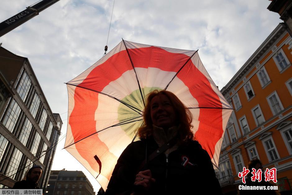 当地时间2015年3月15日,匈牙利布达佩斯,民众游行庆祝匈牙利国庆节,匈牙利总理维克托·欧尔班出席。