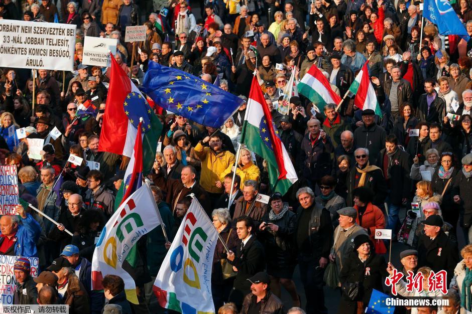 当地时间2015年3月15日,匈牙利布达佩斯,民众游行庆祝匈牙利国庆节,匈牙利总理维克托·欧尔班出席。
