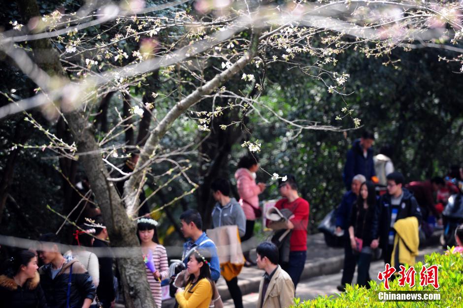 3月16日,三月樱花初放,不少游客趁着晴朗天气来到武大赏樱,其中不乏外地游客。武汉大学樱花大道上的樱花树上少数开放的樱花,大部分目前还只是含苞待放的花骨朵,还未绽放,可武汉大学校园内已是游人如织。中新社发 张畅 摄